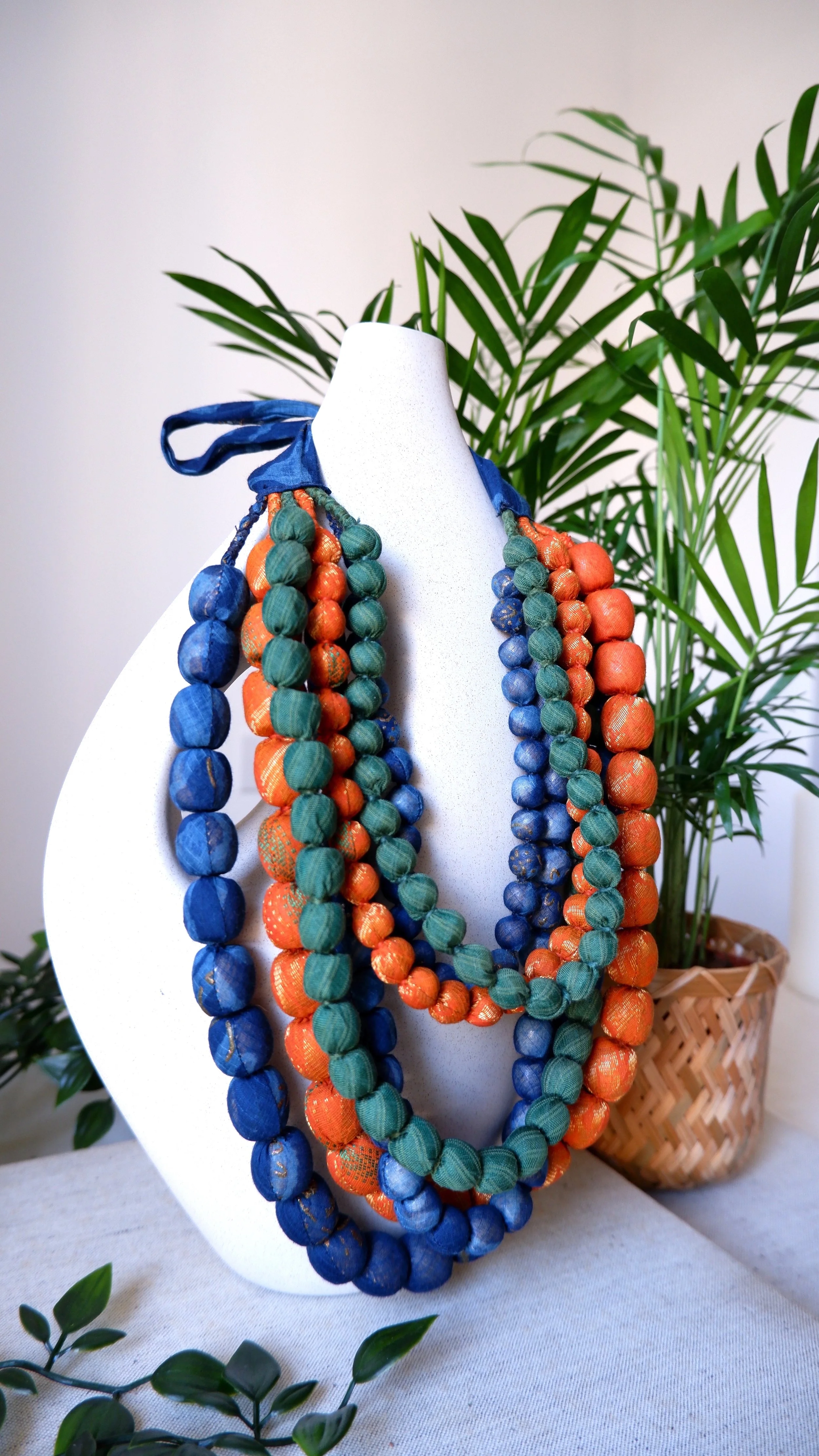 A 3 string beaded necklace wrapped in beautiful circular textiles such as upcycled saris and fabric offcuts. The length is fixed.